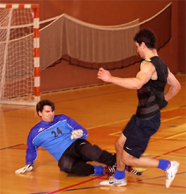 | Vladimír Koutný svým typickým způsobem likviduje další z neúspěšných prúniků ligového mazáka Marka Přílučíka. Stejně jako další hvězdy je na Koutného krátký. |